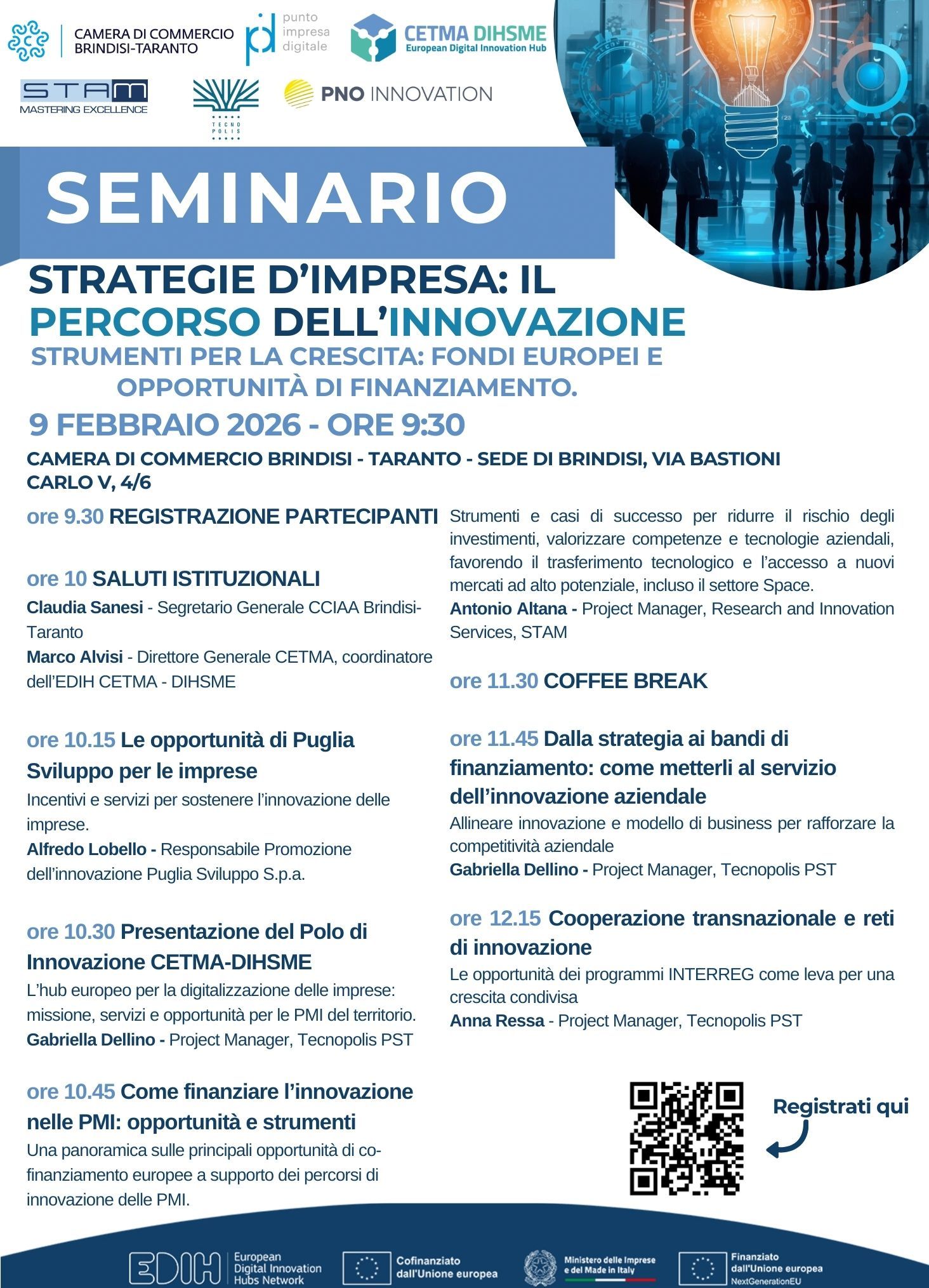 Un ciclo di seminari pensato come un percorso formativo dedicato alle imprese locali che vogliono evolvere e competere nei mercati. Ad organizzarlo il Punto Impresa Digitale della Camera di Commercio di Brindisi-Taranto con il supporto del Cetma-Dihsme. L’iniziativa è rivolta alle imprese del territorio e nasce con l’obiettivo di mostrare come l’innovazione possa rappresentare una leva concreta e accessibile per la crescita e la competitività aziendale.